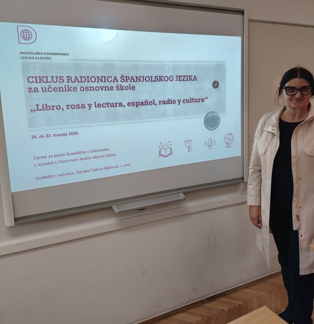 Centar za jezik Sveučilišta u Dubrovniku je u suradnji s Osnovnom školom Marina Držića od 20. do 22. travnja 2026. organizirao ciklus radionica španjolskog jezika „Libro, rosa y lectura, español, radio y cultura“. Radionice je vodila nastavnica Centra za jezike, Daniela Falkoni-Mjehović, viši predavač za španjolski jezik, uz izvoditeljice Marijanu Njirić, profesoricu španjolskog jezika i povijesti i Mateu Mustapić, profesoricu hrvatskog jezika iz OŠ Marina Držića i Alena Rokija, glavnog urednika UNIDU radija. Na radionicama su sudjelovali učenici sedmih i osmih razreda OŠ Marina Držića.