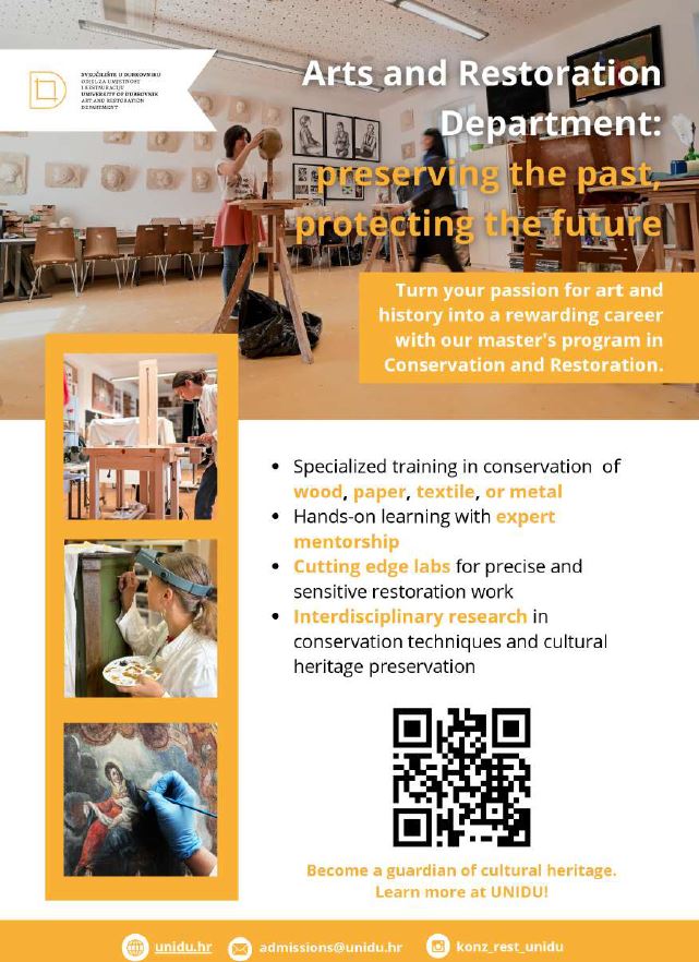 The Master’s program in Conservation and Restoration provides specialized training in preserving materials like wood, paper, textiles, and metal. Combining theory with hands-on experience, students work in advanced labs and gain practical skills through workshops and field projects. Placements at the Croatian Conservation Institute, museums, and cultural institutions across Croatia, along with opportunities for international study via Erasmus+, offer expert mentorship in both traditional and modern techniques. Graduates are prepared for careers in museums, galleries, and cultural heritage preservation, contributing to the protection of global heritage.