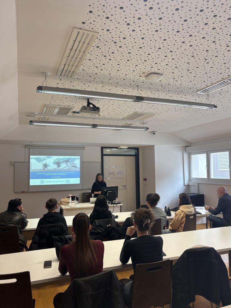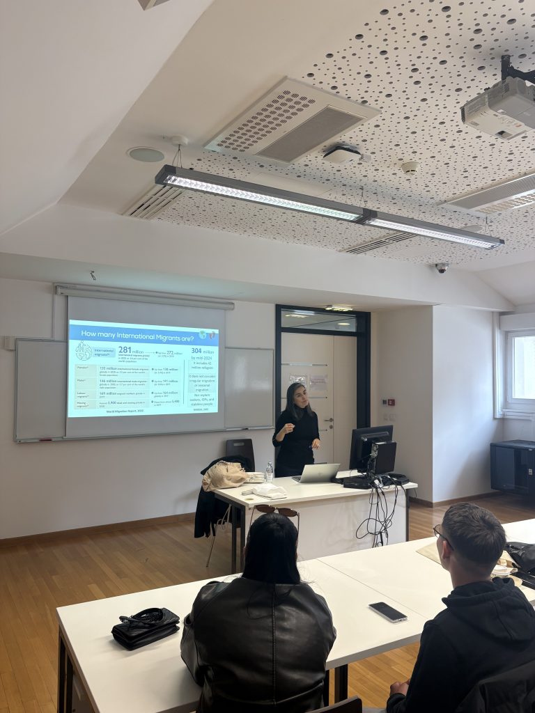 U predavanju održanom za studente treće godine prijediplomskog studija Mediji i kultura društva predstavila je suvremene migracijske procese i njihove uzroke, s posebnim naglaskom na globalne migracijske trendove te povezanost migracija s pitanjima mira, sigurnosti, održivog razvoja i ljudskih prava. Studentima je također približila međunarodne okvire koji oblikuju odgovore na migracije i utječu na razumijevanje suvremene globalne mobilnosti.