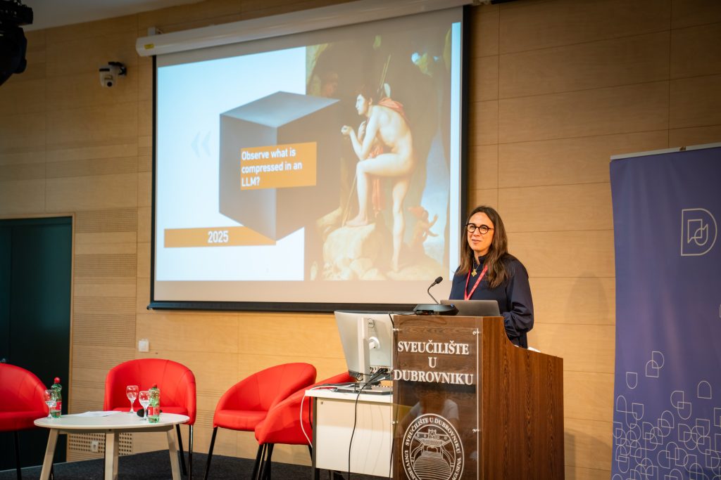 Uslijedilo je prvo pozvano predavanje Generative AI Lifecycle koje je održala Murielle Popa-Fabre (AI & Society Institute, École Normale Supérieure). Upozorila je da prelazak s ekonomije pažnje na ekonomiju namjere stvara uniformnu publiku, čime se ugrožavaju pluralizam medija i kognitivna autonomija, a granica između istine i utjecaja postaje nejasna.