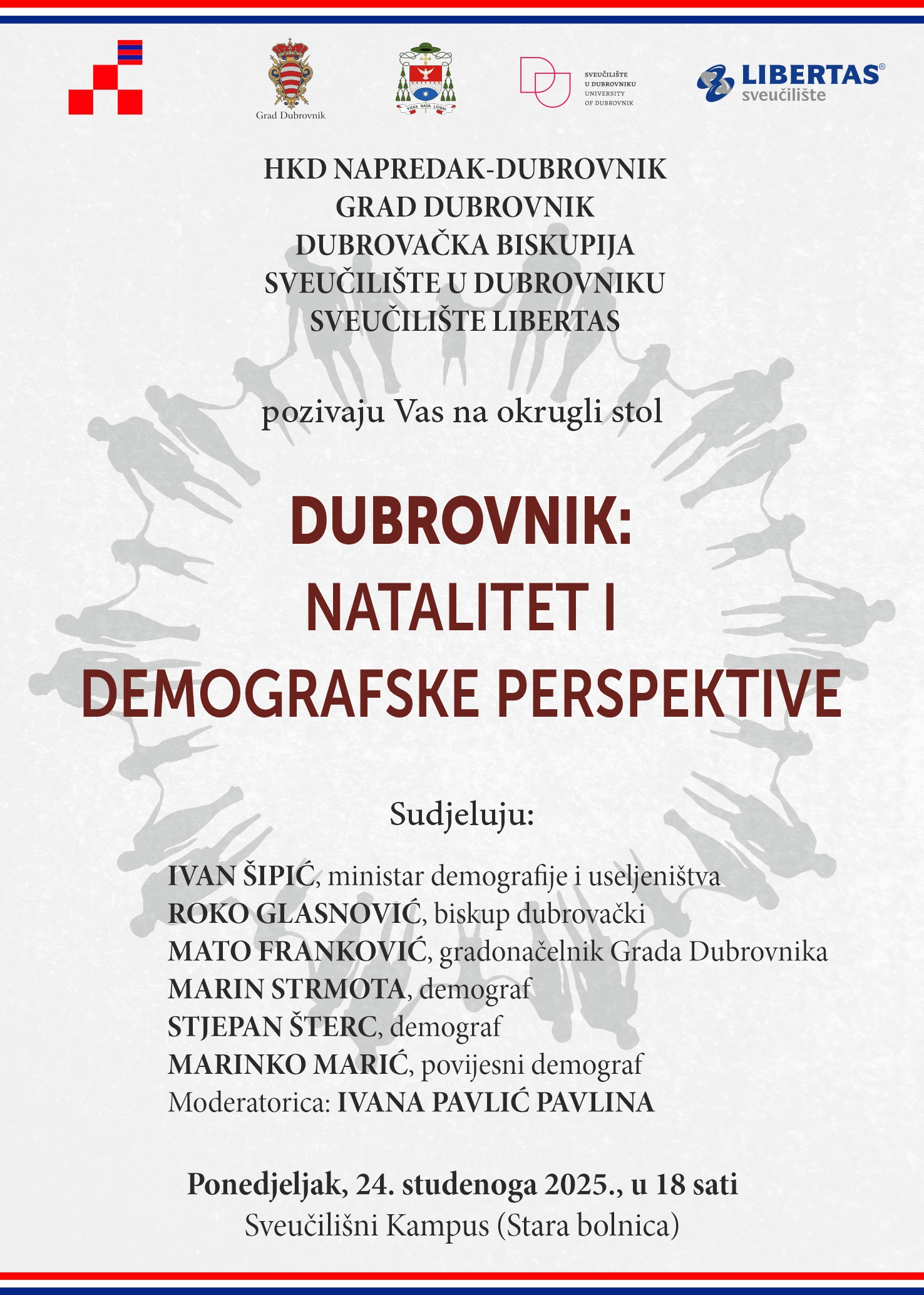 Sveučilište u Dubrovniku, u suradnji s HKD-om Napredak – Dubrovnik, Gradom Dubrovnikom, Dubrovačkom biskupijom i Sveučilištem Libertas, organizira okrugli stol „Dubrovnik: natalitet i demografske perspektive“, koji će se održati u ponedjeljak, 24. studenoga, u 18 sati na Kampusu Sveučilišta u Dubrovniku.