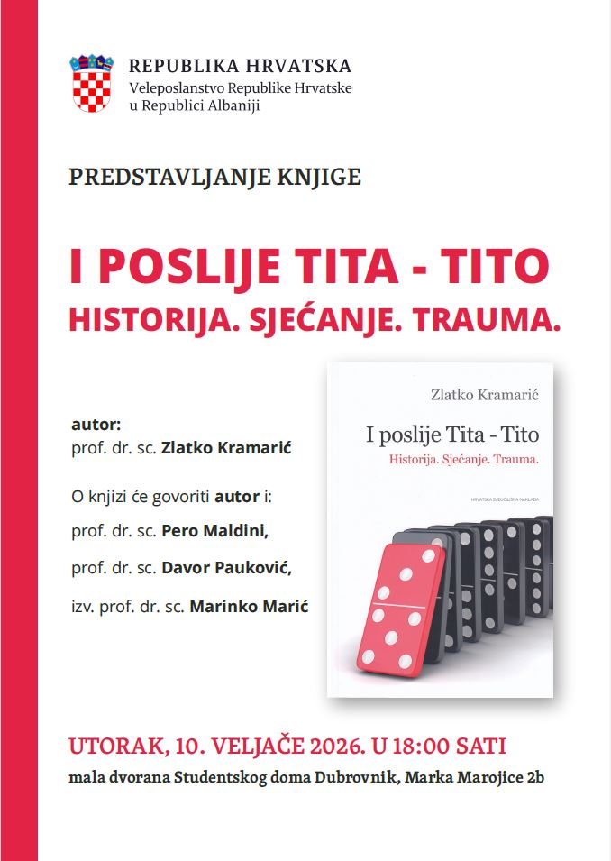 U utorak, 10. veljače, u 18 sati u maloj dvorani Studentskog doma u Dubrovniku održat će se promocija knjige „I poslije Tita – Tito: Historija. Sjećanje. Trauma.“ autora Zlatka Kramarića.