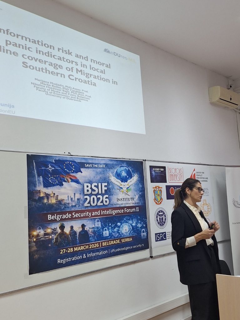 Na međunarodnom forumu Belgrade Security and Intelligence Forum (BSIF) 2026, koji se održao od 27. do 28. ožujka u Beogradu, izv. prof. dr. sc. Marijana Musladin sudjelovala je s izlaganjem rezultata istraživanja Information Risk and Moral Panic Indicators in the Local Media Coverage of Migration in Southern Croatia, provedenog u sklopu institucionalnog projekta Fakulteta za medije i odnose s javnošću Medijska pismenost za otpornost zajednice eDUres-MIL: interdisciplinarnog modela edukacije za Dubrovačko-neretvansku županiju.