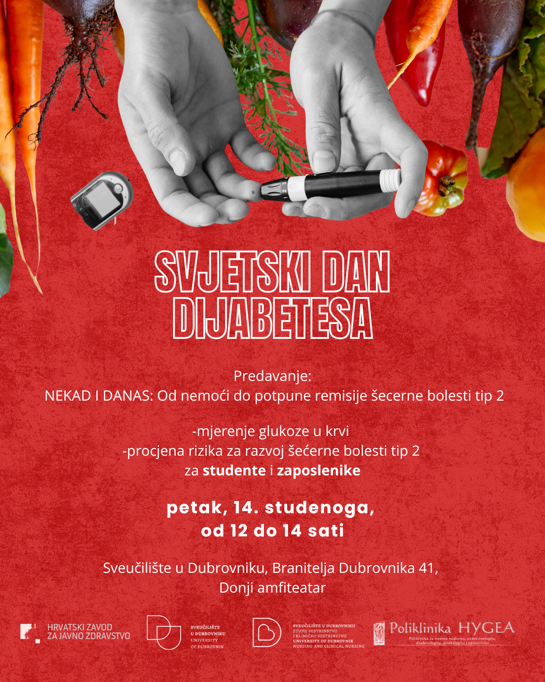 Povodom Svjetskog dana dijabetesa, koji se obilježava 14. studenoga, Studij Sestrinstvo i Kliničko sestrinstvo Sveučilišta u Dubrovniku u suradnji s Hrvatskim zavodom za javno zdravstvo i Poliklinikom Hygea organizira predavanje ‘NEKAD I DANAS: Od nemoći do potpune remisije šećerne bolesti tip 2’ koje će voditi doc. dr. sc. Sanda Tešanović.
