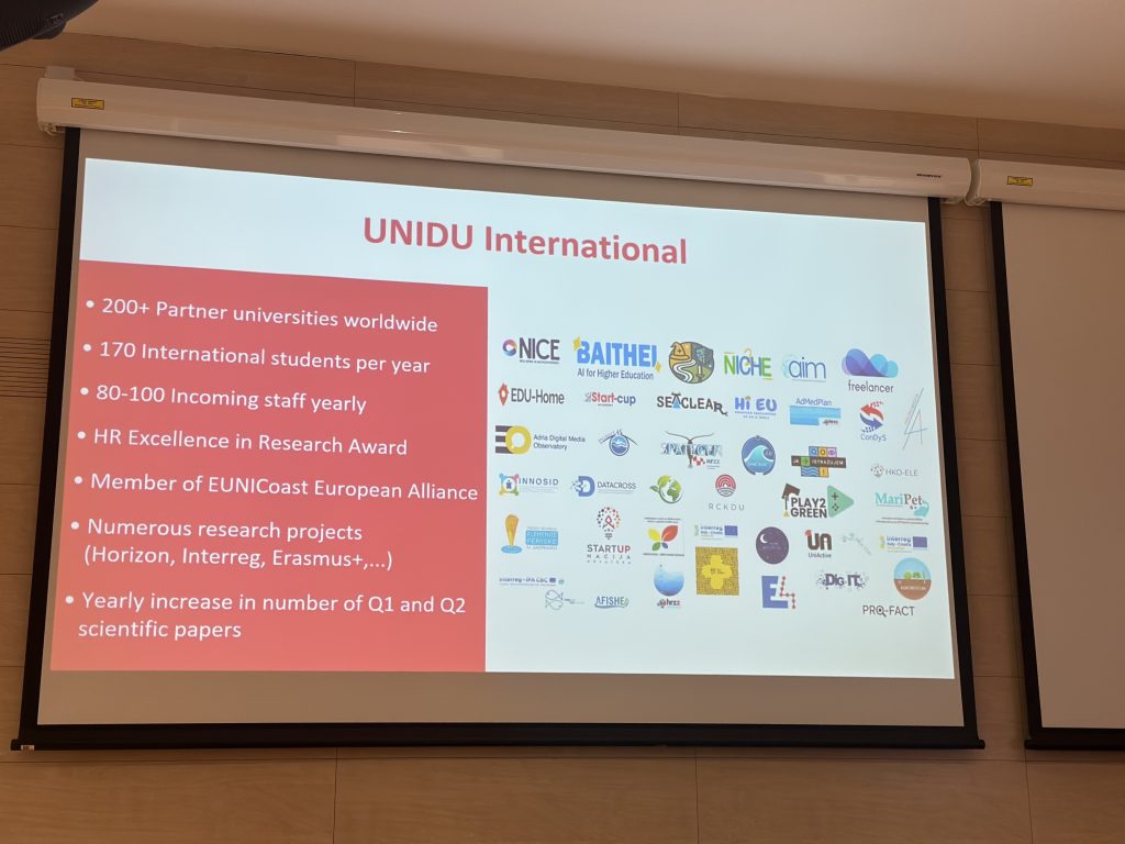 In addition to academic and student life, international students were also introduced to the international projects in which the University actively participates. Particular emphasis was given to the EUNICoast – European University of Islands, Ports and Coastal Territories, an alliance of 13 European universities focusing on islands, ports and coastal regions. Through EUNICoast, UNIDU contributes to strengthening international cooperation, knowledge exchange, and the connection of island and coastal communities through innovation, open science and digital learning. Students were also informed about numerous other projects conducted by the University within the Horizon, Interreg, Erasmus+ and other European programmes, which enhance UNIDU’s research excellence, promote student and staff mobility, and contribute to the sustainable development of both the local and wider community.