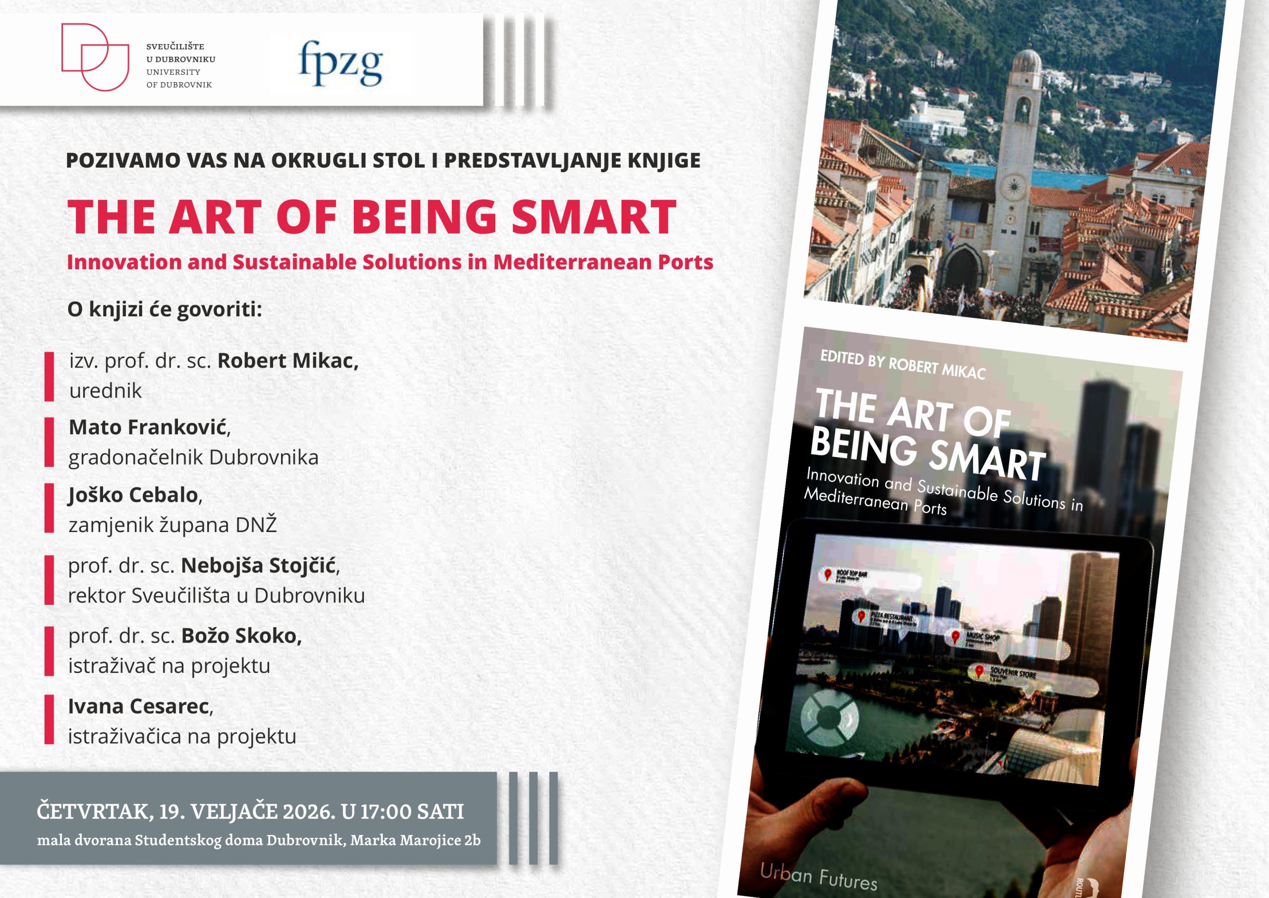 Sveučilište u Dubrovniku organizira predstavljanje međunarodne znanstvene knjige The Art of Being Smart: Innovation and Sustainable Solutions in Mediterranean Ports te okrugli stol o pametnom i održivom upravljanju gradom, koji će se održati u četvrtak, 19. veljače 2026., s početkom u 17 sati u maloj dvorani Studentskog doma Dubrovnik (Marka Marojice 2b).