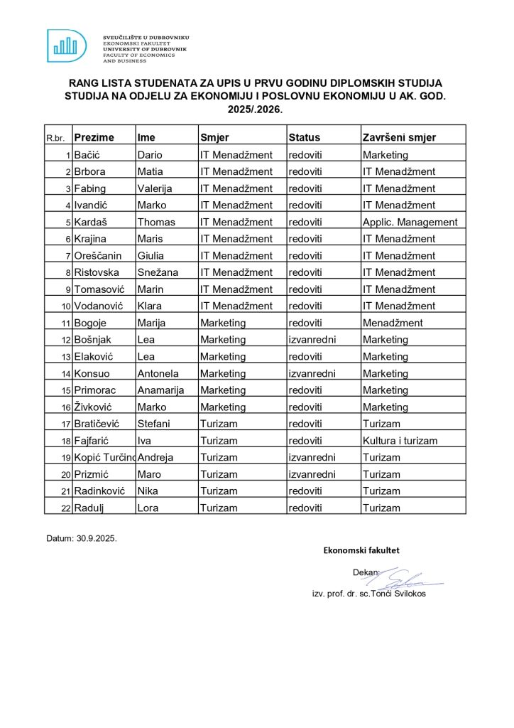 Rang lista studenata za upis u prvu godinu sveučilišnog diplomskog studija Poslovna ekonomija sa smjerovima Turizam, Marketing i IT Menadžment
