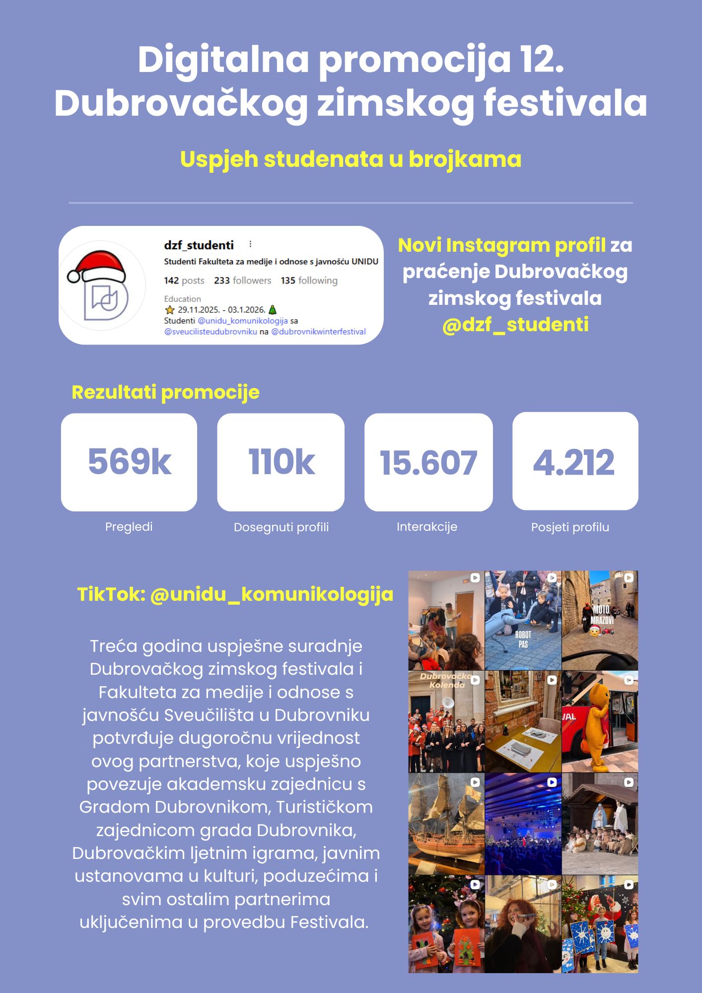 Tijekom 12. Dubrovačkog zimskog festivala studenti Fakulteta za medije i odnose s javnošću aktivno su sudjelovali na čak 149 festivalskih događaja i aktivnosti. Na profilu je objavljeno 139 objava i velik broj priča, čime je ostvaren snažan i dinamičan komunikacijski kanal Festivala.