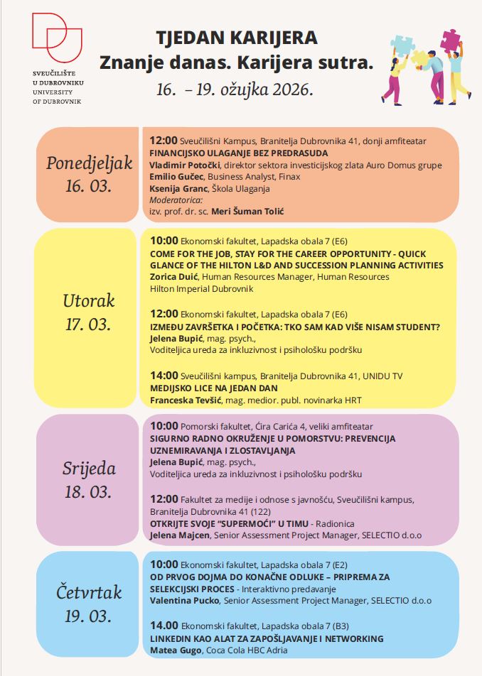 - Predavanje će studentima pružiti praktičan pregled kako izraditi kvalitetan životopis, motivacijsko pismo i pripremiti se za intervju. Objasnit ćemo najvažnije elemente dobro strukturiranog CV‑a, najčešće pogreške te kako se učinkovito predstaviti poslodavcima. Kroz konkretne savjete i primjere, studenti će naučiti kako prilagoditi svoju prijavu i ostaviti profesionalan prvi dojam. Predavanje ih priprema za cijeli selekcijski proces, od prvog kontakta do finalnog intervjua.
